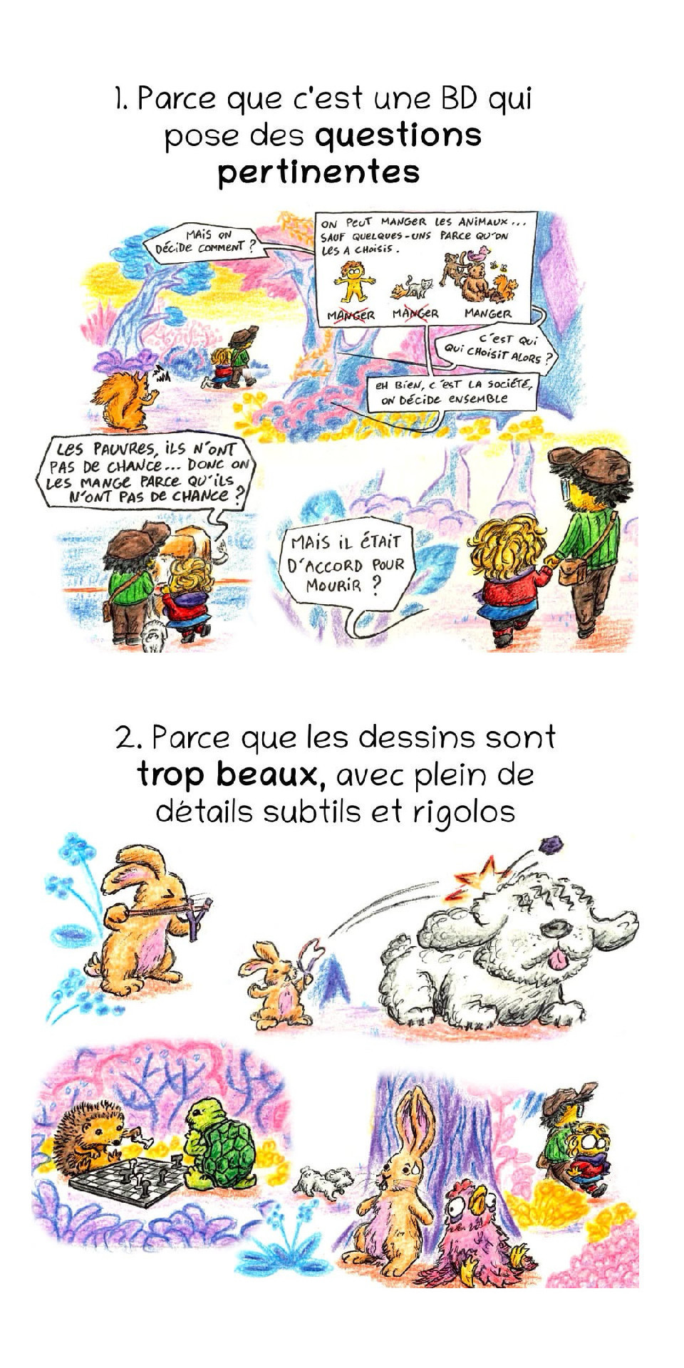 Alors concernant la manipulation, j’utilise ce mot uniquement parce-que le livre paraît s’adresser à des enfants, et parce-qu’il vient de Richard que j’ai pas mal suivi autour de la question de l’éducation à la pensée critique ! Et que j’ai pu observer l’impact qu’il a sur les enfants. Du moins sur une classe de CM2. Evidemment, ils s’identifient à l’enfant. Evidemment, ils partagent le raisonnement : tuer, c’est mal, faire souffrir, c’est mal. Donc manger de la viande, c’est mal. Je ne sais pas où Guillaume Meurice a été chercher la mauvaise foi du lecteur qui s’attache à son entrecote. Mauvaise foi ou pas, je me contrefiche de mon entrecote, et je ne suis pourtant pas d’accord. D’ailleurs, j’ai la vague impression que la BD jeunesse qu’il publie actuellement, dont je partage pourtant plus le contenu (surpêche et destruction de l’océan), suit le même procédé. On sert la patée dans la bouche de nos bambins en espérant qu’ils deviennent des citoyens sains. Pourquoi pas, mais je ne suis pas certain que ça fonctionne vraiment, d’une part, et d’autre part ça manque cruellement de complexité et de poésie, et même d’abstrait, essentiels selon moi à l’éveil de la pensée. Mettre ces livres dans les mains d’enfants, c’est plus que de l’influence. J’ai cité dans mon premier message un conte poétique influençant subtilement et ouvrant une réflexion avec les enfants : « le jour où les ogres ont cessé de manger les enfants ». On lit, on voit ce qu’on a compris, on échange, on questionne. Dans votre livre il n’y a pas grand chose à comprendre, tout est simplifié et prépensé. Je n’ai pas dit aux enfants que je n’étais pas d’accord. Car ce n’est pas mon rôle, mais du coup il n’y a pas matière à en tirer réflexion. Peut-être que pour vous l’évidence est telle que les vieux sont réac dans leur non antispécisme, comme moi, et que les jeunes à venir seront différents.