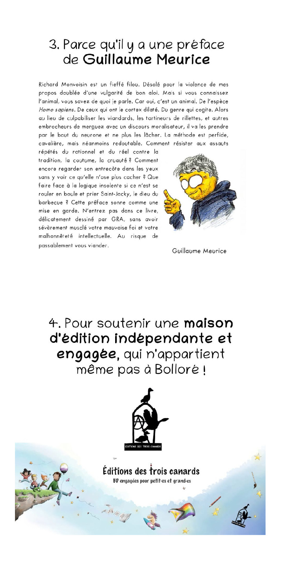 Il a été dessinée par mon copain David Engelibert alias GRA, préfacé par Guilllaume Meurice et édité par une petite maison d’édition chouette et vénère, Les 3 canards.